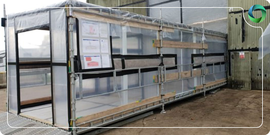 Scaffold Design and Enclosure Construction: A pivotal component of the solution was crafting a scaffold system in three segments, with a working platform at 8 metres. The scaffold design catered to the installation of airlocks and extract fan units on each scaffold lift level and supported the weight of polyethylene enclosures to prevent undue stress on tape seals.